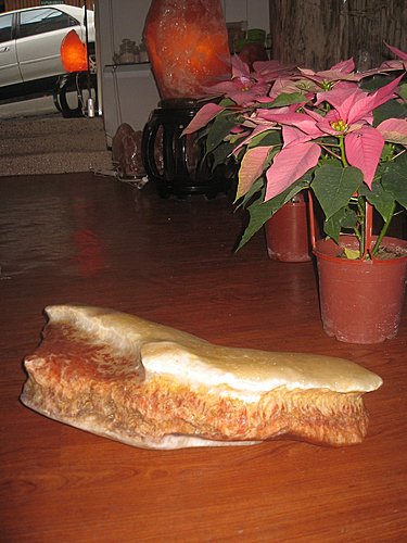 12月12日晚間九點左右,留連在象山的流浪狗小花與妞妞,在象山第一站門前徘徊。其中,妞妞出其不意,以迅雷不及掩耳之速,衝進象山第一站,咬住12.5公斤的豬肉石。牠邊咬邊看我,神情有點兒奇特(可能覺得:『奈也按ㄋ ㄟ』、『怎麼沒豬肉味道』);狠咬幾次後,妞妞使勁兒想拖走,可是太重了,最後只好夾著尾巴跑掉了!這塊連流浪狗也分辨不出真假豬肉的豬肉石,實在有趣。