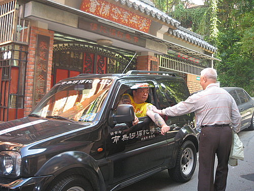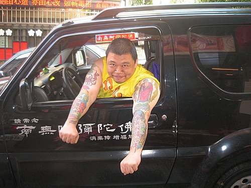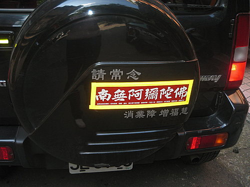 2007年12月11日,淨應開了一輛拉風的吉普車出現在我眼前.車上所見之處盡是南無阿彌陀佛.對照他手臂的阿彌陀佛聖像及圖騰字樣刺青,不惹人矚目也難.我說淨應啊!你還真騷包,用這種方式弘法,我真是服了你.