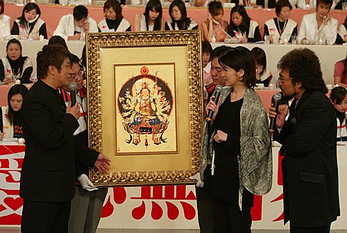 當時 在東森主編東森報報的陳淑芬 捐出名佛畫家郭恩慂的千手千眼觀音黃金畫 由東森主播盧秀芳代為捐出 最後由妙天禪師以新台幣五十萬元標到 做公益大家一起來 很開心