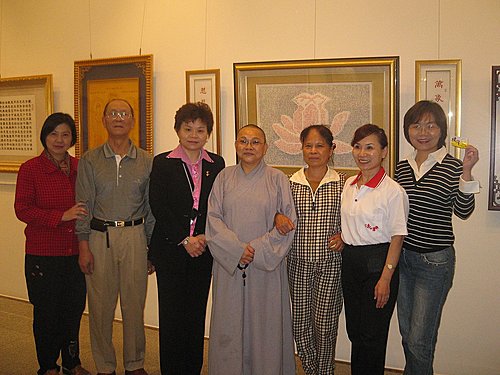 台北市圓山獅子會會長王水村<韋盛>與詹秀蓉老師<中>在象山第一站,圖後為詹老師的純金泥作品大悲咒!