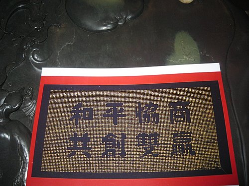 象山第一站有個國寶級的端硯,硯台上方的墨寶,就是海基會贈海協會會長陳雲林的詹秀蓉書法複製品.