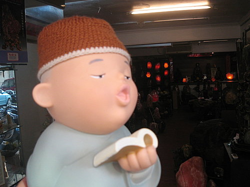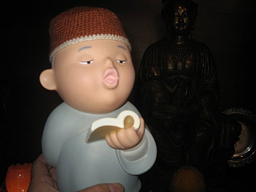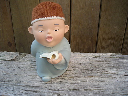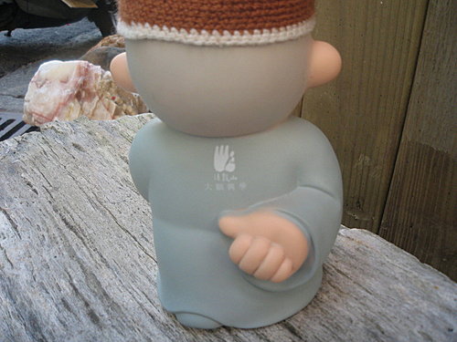 法鼓師姐為興學募款存錢筒小沙彌織了一頂可愛的毛帽 模樣樸拙可愛 頗有聖嚴法師的神韻!