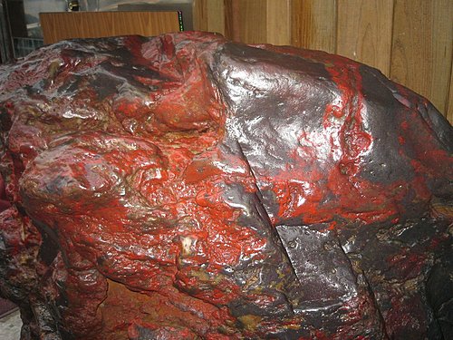 雞血石中除主要成份硫化汞外,還含有少量的致色元素,如鐵,鈦,.感光元素,如硒,碲等