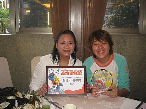 學生電影《背光》獲得2009高雄電影節「平民英雄短片競賽」最佳劇情片獎。該片主角李靜美(左)作東宴請工作團隊,右為《背光》導演馮鈺婷。
