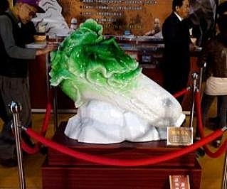 台鹽鹽雕翠玉白菜,白菜造型象徵女子清白,葉上雕有螽斯、蝗蟲,象徵多子多孫、富貴雙全。鹽雕翠玉白菜是台鹽的發燒產品,一顆新台幣24萬元。