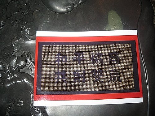 二次江陳會,海基會準備了鑲有六千個小金字的「和平協商,共創雙贏」金筆鏤空書法,送給大陸海協會會長陳雲林,令人印象深刻。