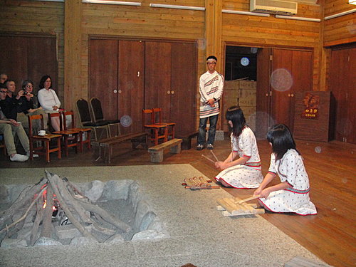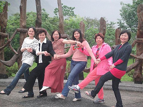 2010年3月22日,我們在太魯閣立德布洛灣山月邨開心起舞,左起:江美美、詹秀蓉、陸慧娥、慧松媳婦與太太、陳淑芬。(陸慧娥裙上出現法輪,這是詹老師新買的sony相機所攝)