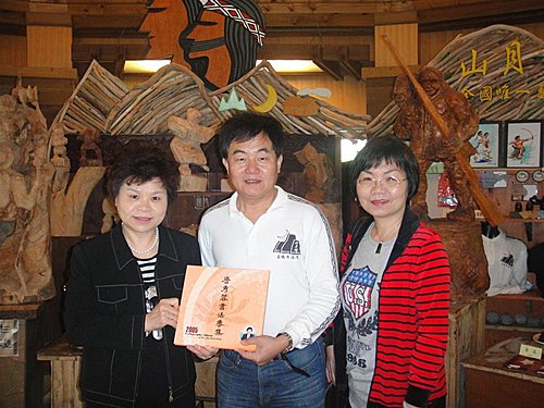 信奉天主教的飯店負責人鄭明岡(中),是布洛灣山月邨唯二的非太魯閣族人,詹秀蓉(左)送他一本書法專輯,鼓勵他繼續為理想打拚,右為陳淑芬。鄭明岡說,山月邨是賞鳥絕佳的觀察點,四周雄偉的高山,茵綠如毯的大草原,大自然的美麗畫作,只有山月邨才看得到。 江美美攝影