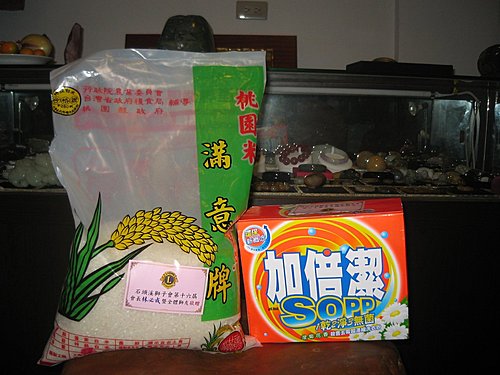 這包米和洗衣粉,是我的小兒子張家睿捐血500cc的贈品。家睿說,他放學時看到學校門口有捐血車,想到媽媽以前曾輸血急救過,就和同學走向捐血車完成「義舉」,以效法曾經救過媽媽的捐血人。