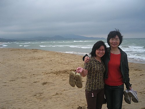 2009年5月1日,我們班一年一度的同學會在宜蘭頭城舉行,賴秀貞(左)與陳淑芬(右)在海邊戲水。(同樣是在東森工作10年,淑芬已被後浪打趴在沙灘上,而堅強又認真的秀貞,可還在浪頭上呢!加油啊,秀貞!) 唐淑華攝影