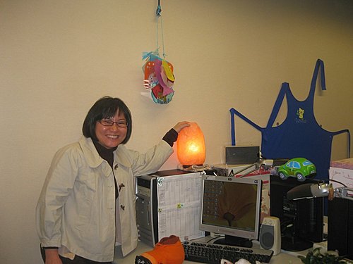 賴秀貞在東森的辦公桌上,點了一盞象山第一站的玫瑰鹽燈,能釋放負離子、增加健康能量的鹽燈,很幸運的日夜陪伴秀貞每個加班的時刻!陳淑芬攝影