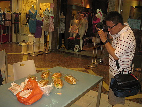 這是蔡佳蓓與江望平伉儷,各排隊40幾分鐘,才買到的炒麵麵包和大腸包小腸,蔡明哲趕快把這些<戰利品>拍下來,把夜市美食拿到沐蘭汽車旅館分享剛抵達台中的同學! 陳淑芬攝影