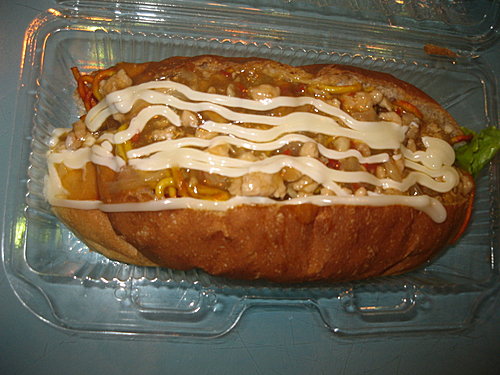 銘傳傳管所7E同學會,第四站來到台中逢甲夜市。位於夜市內的炒麵麵包,是一項具有創意的特色小吃,以類似大亨堡般的脆皮麵包,在麵包內層搭配嫩Q的烏龍麵條,並配上不同的口味料理,作為主打特色。炒麵麵包一份50元、兩份90元;蔡佳蓓同學苦等45分鍾,終於買到6份共270元;份量之多,讓我們吃撐了! 陳淑芬攝影
