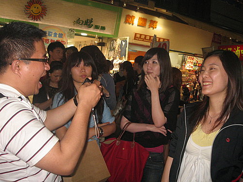 逢甲夜市美食包括:石家莊滷味、雞腳凍、日船章魚小丸子、好而大雞排、小A起司洋芋、麻辣臭豆腐、全聚烤鴨夾餅、薄鹽燒鮮蝦、干貝花枝球、五角冰舖、東山鴨頭、阿華黑輪店、逢甲阿伯特製霜淇淋、二林蚵仔煎、全藥燉、成龍雞排&成龍生機飲食水果凍飲……左為民視生活組召集人蔡明哲,一邊享受夜市美食,一邊用手機把現場畫面,傳給正在高速公路趕下來的史玲琦等同學,右為本班<貴婦>盧培燕。 陳淑芬攝影