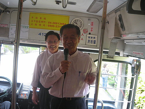 杉林溪遊樂公司董事長陳昭坤(執麥克風者),在遊園接駁車上,為大家介紹前司法院長賴英照大法官,同車遊客與有榮焉。 陳淑芬攝影