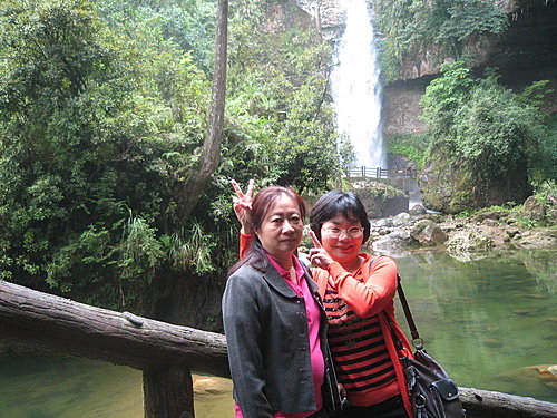 921大地震,杉林溪因受創嚴重,曾封閉4年。如今再呈現國人眼前的青山綠水,令人更加珍惜。由於今年雨量充沛,因此每一座瀑布洶湧的水量,從山頭傾洩而下,展現出大自然澎湃的氣勢,讓陳淑芬(右)和友人王玲瑛心曠神怡。 許美姿攝影