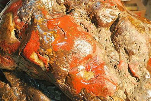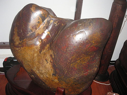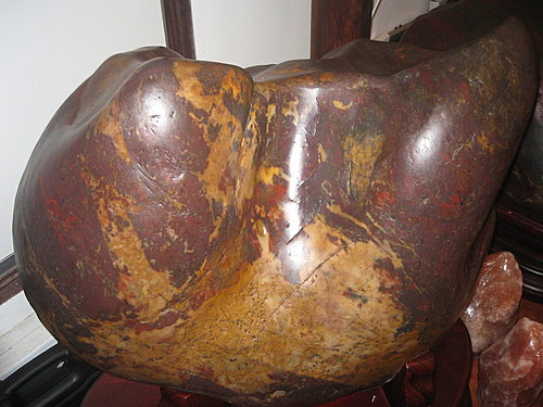 如此碩大的雞血石,堪稱稀世珍寶,外形像……母獅,您看到了嗎?這座雞血石的特色在雌雄同體,從不同的角度看,形似公獅與母獅<夫妻同石>。長100cm 寬90cm 高50cm 重量約500kg