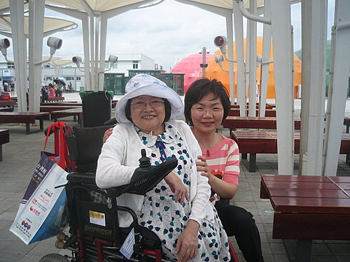 中華民國99年9月9日,我們陪同台灣身障朋友在艷陽下,前進上海世博中國館,遠方兔子圖騰是澳門館。 陳淑芬攝影