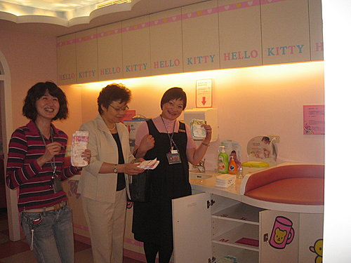 已經懷孕6個多月的昇恆昌免稅商店經理鍾佳雯(右),與名書法家詹秀蓉(中)、同事黃婉婷(左),在桃園國際機場第二航廈「Hello Kitty育嬰室」,參觀江松樺創辦人提供給旅客的紙尿褲等嬰兒用品。 陳淑芬攝影