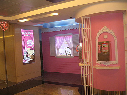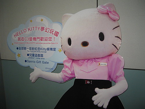 昇恒昌免稅商店獨家引進Hello Kitty授權的候機室,搭配兒童遊戲區、育嬰室,以及世界時間牆與電話亭,粉紅色調在明亮燈光的航站中顯得獨樹一格、亮眼,很能吸引年輕女性與小孩的目光,也為一板一眼的航站增添流行童趣與創意。