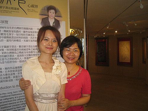 名書法家詹秀蓉(右)表示,她的「微.巨心視界」細字書法展,於8月18日至11月17日在桃園機場第一航廈昇恆昌文化藝廊展出,非常感謝江松樺創辦人的美意。詹老師說,平日行事低調的江松樺創辦人,多年來共成立了三個基金會,長期捐助慈濟、紅十字會、桃園地區的育幼院、法務部等單位,對醫學團體的捐贈也不遺餘力。(左為昇恆昌孕婦經理鍾佳雯) 陳淑芬攝影
