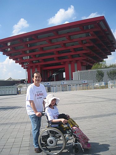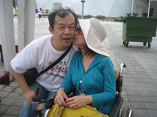 台大教授孫效智推著愛妻楊玉欣的輪椅,前進上海世博中國館。 陳淑芬攝影