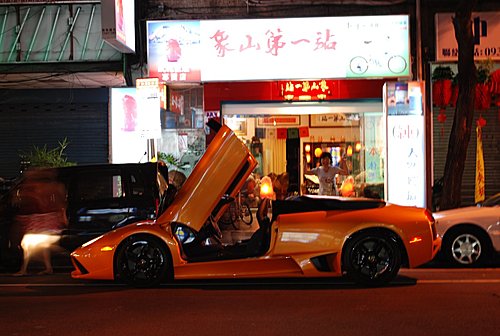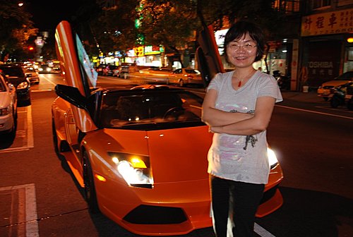 價值數千萬台幣的藍寶堅尼跑車,停放在台北市信義區莊敬路215號的象山第一站前。玫瑰鹽燈陳淑芬眼明手快,在車主同意下,留下這一系列「香車與歐巴桑」的畫面。 張家豪攝影