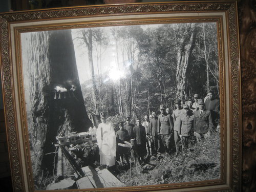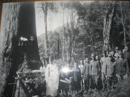 圖為日據時代,日本祭司(穿白衣戴高帽者),在阿里山舉行砍伐紅檜神木儀式;前為日本警察,後為衣不蔽體的伐木工和搬運工(許多為當地鄒族原住民)。 這張獨家照片由檜木達人賴水清蒐藏 玫瑰鹽燈陳淑芬翻攝