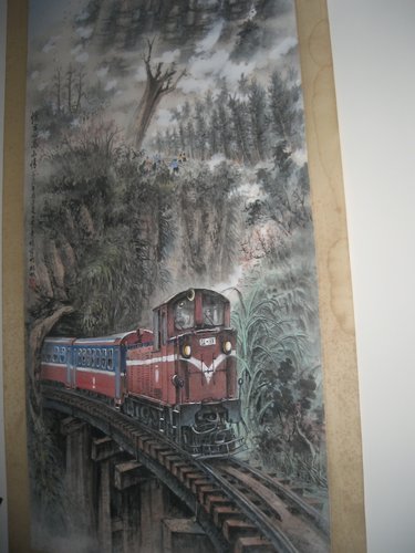 這張結合阿里山火車與神木的畫作,是檜木達人賴水清的蒐藏。賴水清說,日據時代的阿里山鐵道枕木,都是檜木所裁製。從這張阿里山火車,穿山洞過橋的畫面,可一窺當年歷史。 陳淑芬攝影