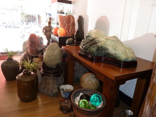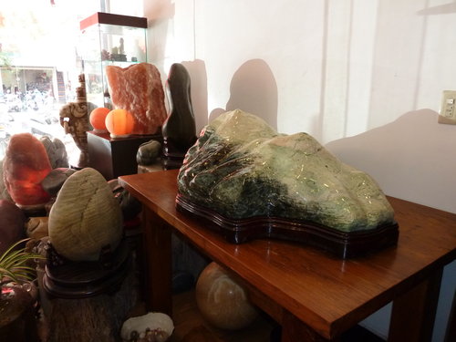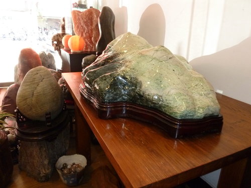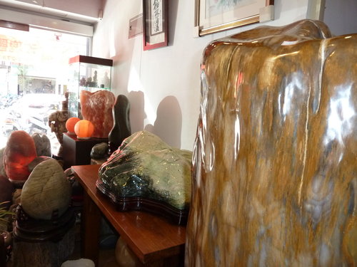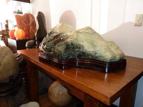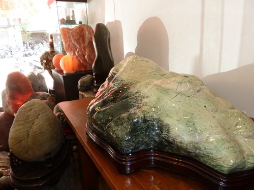 產自花蓮的豐田玉(中),被視為「台灣國寶」;右為來自印尼的木化玉,約八百公斤、左為一百多公斤的喜馬拉雅山玫瑰鹽礦與圓形鹽燈。