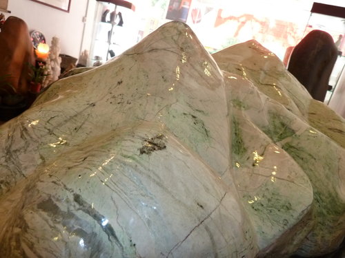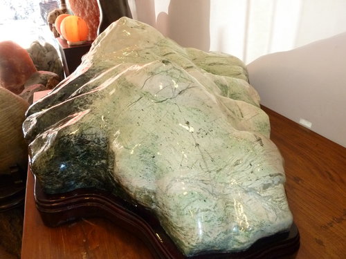 2011年底,玫瑰鹽燈陳淑芬的老公,從外頭運回這座約五百公斤的台灣豐田玉。這座形如台灣的寶玉,被老公藏在外頭十幾年,最近因為借放的朋友賣房子,老公才把它運回來。許多女人擔心老公在外頭有「小三」,對「玫瑰鹽燈」而言,石頭、美玉,才是我婚姻生活中的「小三」啊!過去,因為我的堅決反對,老公把偷偷買來的玉石,分散藏放各處;玫瑰鹽燈作夢也沒想到,從事新聞工作的我,如今居然要靠「變賣」這些玉石過生活。想起當年的執意反對,以及老公的善意欺騙,讓我想到作家胡蘭成與張愛玲,他們在亂世簽訂終身的婚約書寫著:「願使歲月靜好,現世安穩。」很多時候,我們在人生的道路上,總希望面對所有的真相,尤其是婚姻的本質。然而,看淡生命的起落,玫瑰鹽燈漸漸了解,得到真的同時,意味著要捨下。何來天長地久,又有多少銘心刻骨?或許,平淡容易讓人平靜,捨下對迷茫的執著,只願歲月靜好,現世安穩。