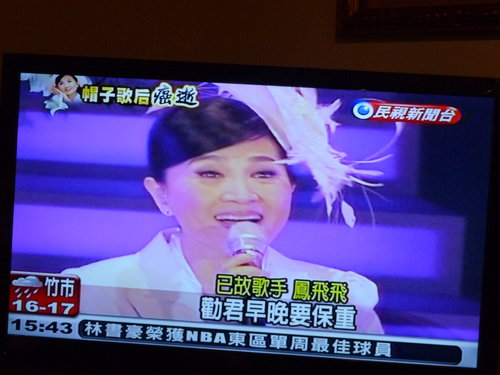 「帽子歌后」鳳飛飛2012月1月3日因肺癌過世,此消息於2月12日,她的兒子將她骨灰奉厝於桃園大溪鎮佛光山寶塔寺後,才對外公佈。鳳飛飛過世的新聞,令人震驚,各媒體也大篇幅報導。2012年2月14日,時報週刊資深記者劉建宏到象山第一站採訪玫瑰鹽燈陳淑芬,因為淑芬過去曾擔任十幾年影劇記者,與許多天王、天后有交情。然而,鳳飛飛於1980年3月嫁給香港旅遊大亨趙宏琦後,就鮮少與圈內人來往,對記者更是敬而遠之。因此,淑芬僅能就她閨中密友口中得知其生活一、二;但她的密友,也跟鳳飛飛一樣低調,所以只能跟劉建宏說「抱歉」了! 畫面為民視新聞,鳳飛飛生前輕唱著「流水年華」:「朦朧的街燈 靜靜躺在小雨中 往事又掠過我心頭 猶記離別的時候 緊緊握住我的雙手 輕輕一句多珍重 眼兒也朦朧 ....層層的相思也悠悠