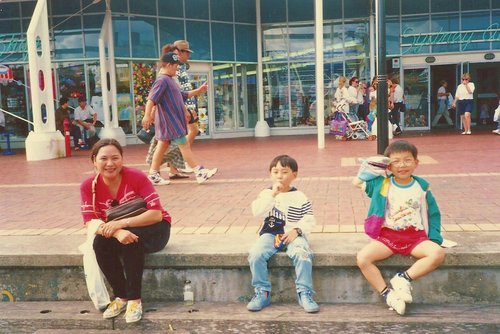 當時美華報導的攝影徐文彬(左二),是Zonglin(右二)和家豪(左)最喜歡的「愛德華叔叔」,右為會計洪美麗的兒子周昱達。遠處可看到廣告部經理楊淑芳和體育記者施淑芳,正在叫自家的兒子:「別再玩了!」當時,家豪和Zonglin在黃金海岸玩累了,正由阿彬叔叔領著走向遊覽車。