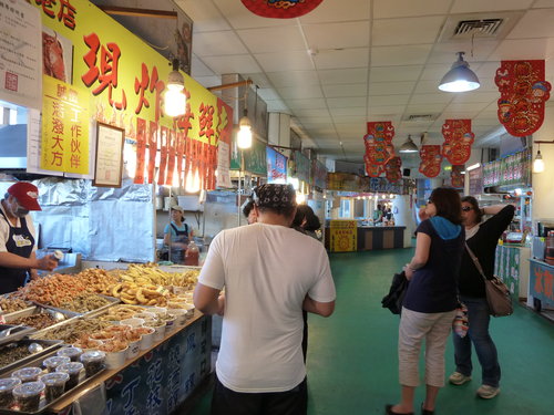 此為永安漁港漁人碼頭內的攤商,販售各類熟食海鮮。玫瑰鹽燈陳淑芬的同學,正要採購中.......