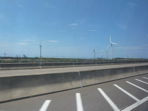 永安漁港位於桃園縣新屋鄉永安村社子溪北岸,自行開車可由中壢交流道下高速公路,循114線道西行即抵永安漁港,全程約 19.6 公里。畫面中為玫瑰鹽燈陳淑芬在車上所拍到的台電風力發電風車,據明哲同學說,那些發電風車,每支造價上億台幣呢!