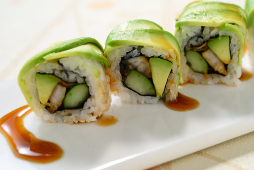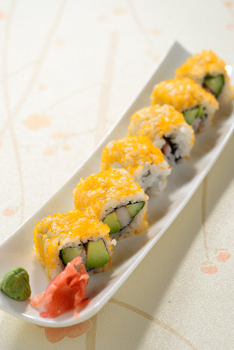 SAKE開店前的試吃會中,受邀親朋都對該店4種不同口味的捲壽司讚不絕口,認為那應是店裡未來的招牌賣點!「酪梨壽司」是將青綠酪梨削薄,一層層包覆在飯團外面,遠看像一塊塊翠玉!