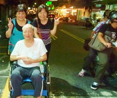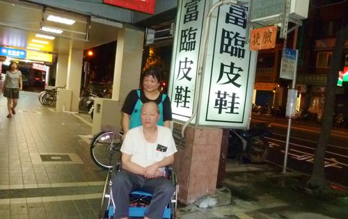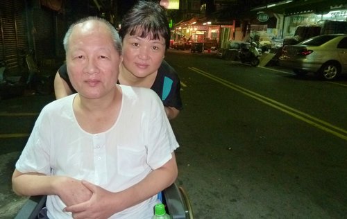 「神愛我!」2012年6月27日晚間10點多,玫瑰鹽燈陳淑芬(後右)下班行經吳興街夜市時,看到富臨皮鞋的老闆娘胡艾琳(後左),用輪椅推著她那因急性腦栓塞開腦6次的老公楊旭復(前),緩緩行進。本來已與他們擦身而過的淑芬,回頭看這對患難夫妻的背影,我追上去對他們說:「我以前是記者,能不能採訪你們的故事,在我的部落格報導?」曾是計程車司機的楊旭復,2011年9月2日腦栓塞重度昏迷,在醫師都不樂觀的情況下,他的家人全力搶救他。半年之內,楊旭復的頭顱動了6次大刀,目前他的頭蓋骨是用3D技術特製的材質(等於頭顱有三分之一戴了『安全帽』)。由於腦部受創嚴重,楊旭復有大部分記憶喪失,尤其語言功能幾乎無法運作。當我跟楊太太在溝通採訪時,楊旭富張著一雙大眼望著我,好久好久,他才從口中迸出:「神~愛~我~~~」三個字。胡艾琳說,那三個字,也是她老公目前唯一說得清楚的語言。 (此篇報導是2012年所撰寫,目前楊旭復先生已能慢慢起身走路復健,語言功能與記憶也漸漸回復中)(2013年6月6日晚間10點多,楊旭復伉儷親臨象山第一站,更多感人的故事,待續中...)以下內容是2012年6月的報導摘要: