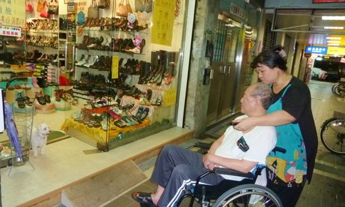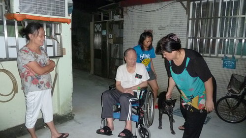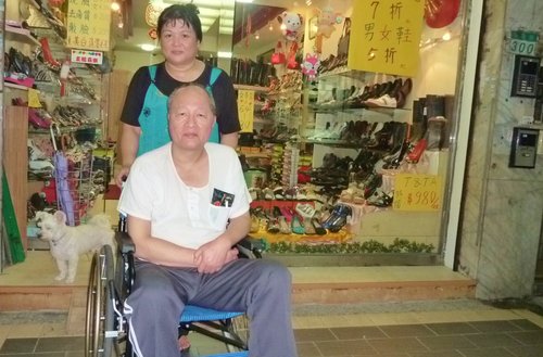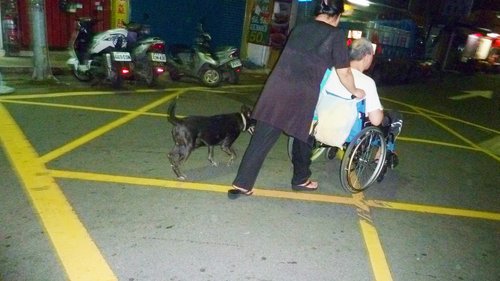 胡艾琳經營富臨皮鞋店,晚上9點打烊後,才有時間推著老公的輪椅出來散步。我們碰面時,她已推著輪椅在吳興街、莊敬路來回繞了一個鐘頭,上衣都被汗水濕透了。「我邊推邊提醒老公這是哪裡,希望能藉此幫他恢復記憶力!」胡艾琳說,她很感謝養了15年的老狗「來福」(左),當她的護衛。看著這對患難夫妻和忠犬,走在午夜的街頭,沉重的步伐中有真情,我突然感動得眼眶都濕了,並按下這張快門.....