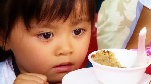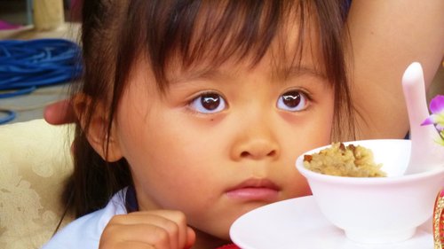 孝恩看到一點兒也不可怕的「新娘」,開始乖乖吃飯!(這是兩歲的她,生平第一次看到新娘、第一次聽到「新娘」這個名詞!)