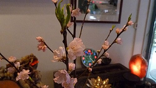 桃樹開花有季節性,通常在每年春節前後開花,也有人乾脆買株桃花種植在門前,年年看到桃花朵朵開!(門前種植桃花要很小心,因為桃樹不像鹽燈是絕對的「正桃花」,萬一流年不對種植到「爛桃花」,那可就麻煩!)(畫面中的桃花,是前年朋友送我的桃枝,我將它插在甕中遇水則「發」;枝葉處不但含苞開花,根部還生根發嫩芽呢!)