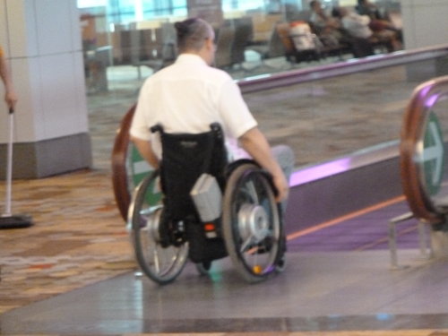 「玫瑰鹽燈」淑芬的新加坡之行,一方面也是考察當地無障礙空間設施,作為國內社福單位的參考。那天,我在新加坡樟宜國際機場看到這位輪椅「小飛俠」,帥氣地從我眼前「開」過,所以迅速用相機記錄這畫面。沒想到他就是台灣的廣告才子!據廣告才子之前受訪表示,他從小個性就非常好強,身高176公分的他,總是撐著柺杖,要跟正常人一樣站得挺直,朋友吆喝去玩,他也毫不猶豫跟著上山下海。這是一種彌補作用。「從小我就不知道什麼是『跑』,連穿褲子都要坐著穿。所以現在我開車就要開的飛快。」但是拿柺杖的使力方式不當,卻讓他腰部長期酸痛,有時還會因為重心不穩而滑倒,爬起來更麻煩,使得他走路經常提心吊膽。但他一直抗拒坐輪椅,擔心自己就變成了真正的殘障人士。