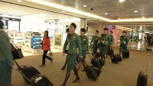 這群長榮機師與空姐們,正以「上戰場」的精神,行經第二航廈免稅店,準備上機出勤囉!