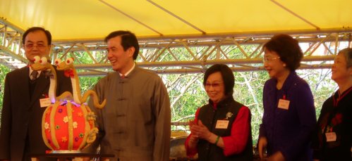 新春文薈主人馬總統正在「畫龍點睛」,右起:作家陳若曦、林澄枝副主委、辜嚴倬雲女士等。